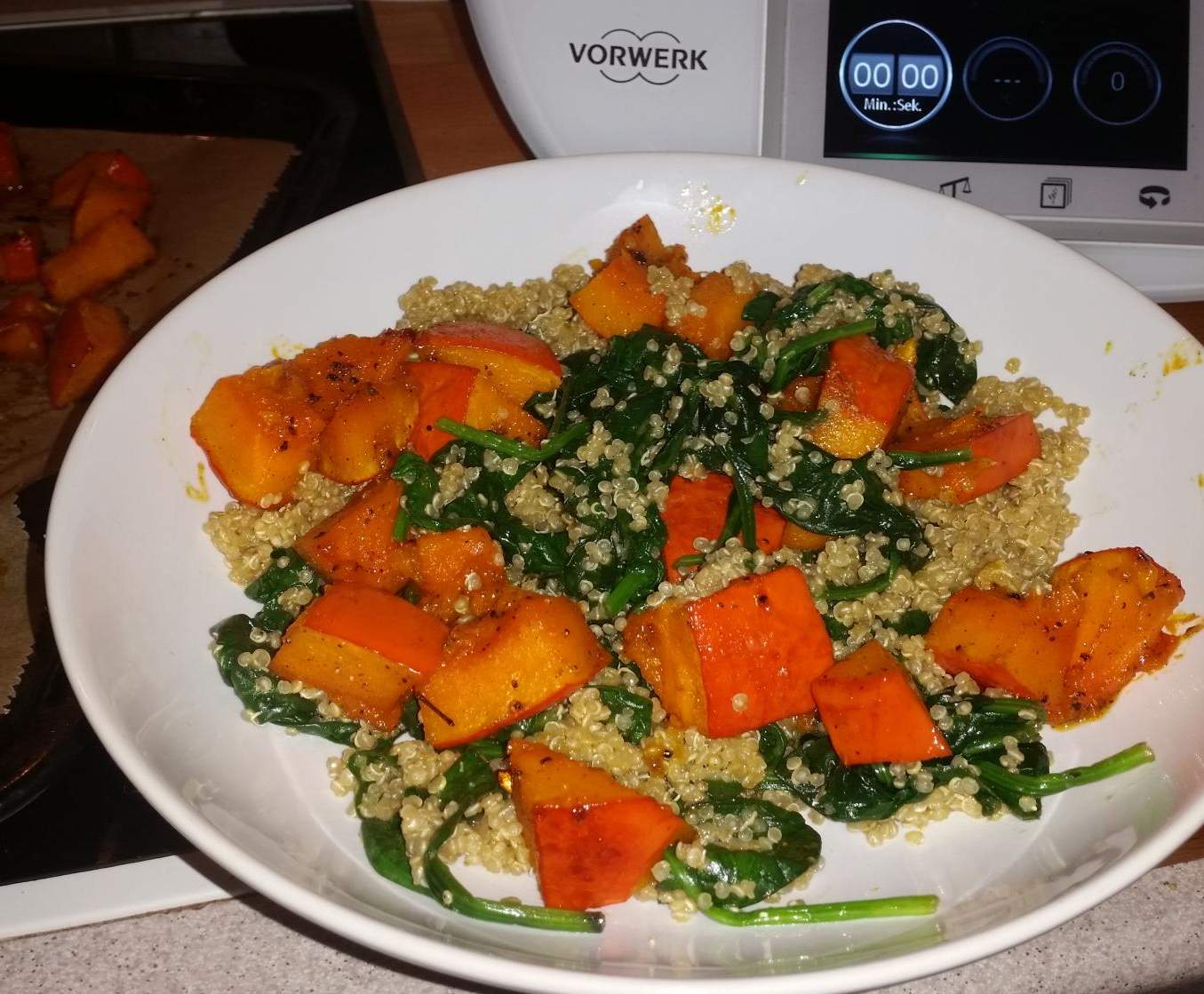 Warmer Quinoa-Spinat-Salat mit gebackenem Hokkaido-Kürbis (