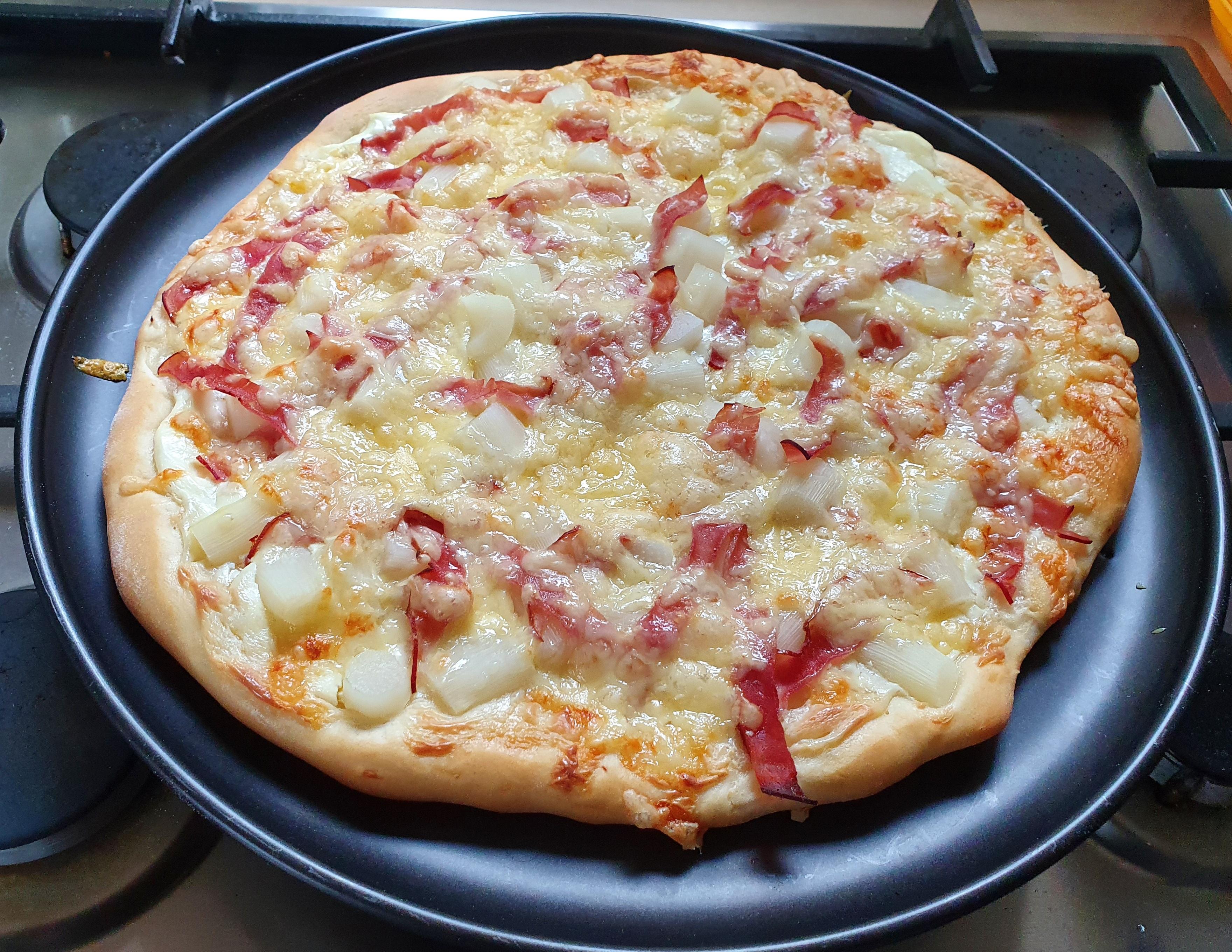 Pizza Bianca mit Spargel und gekochtem Schinken