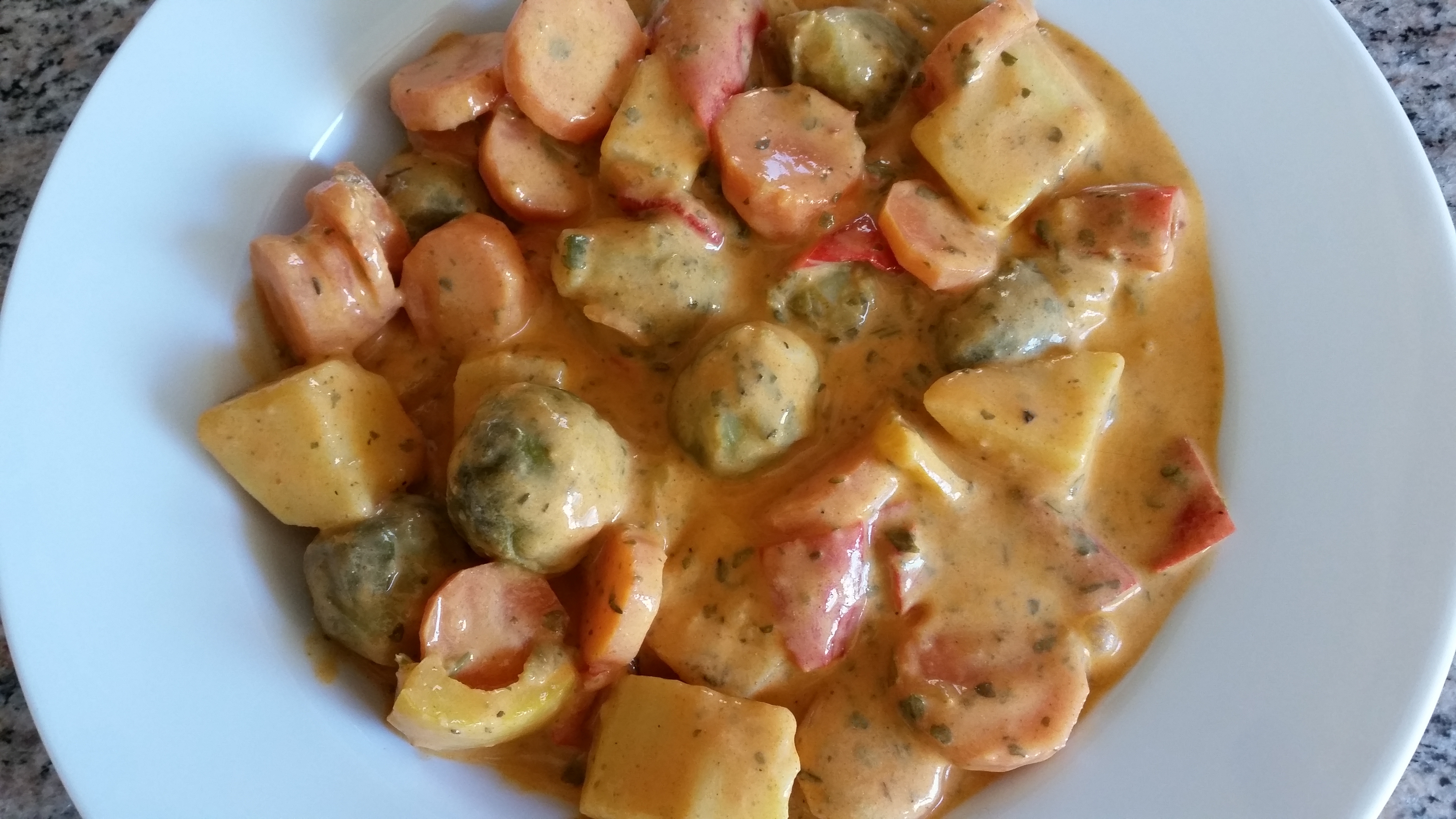 Kartoffeln in Stücken in das Garkörbchen geben und einhängen Gemüsebrühe in [locked] Rosenkohl angetaut in den Varoma geben ...