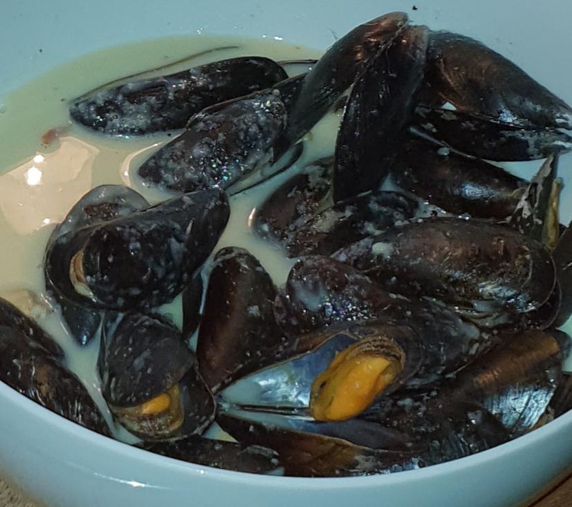 1. Die Miesmuscheln, waschen und säubern. Alle Miesmuscheln in den Varoma geben und mit Salz und gemahlenem Pfeffer würzen. Das Hellgrü ...