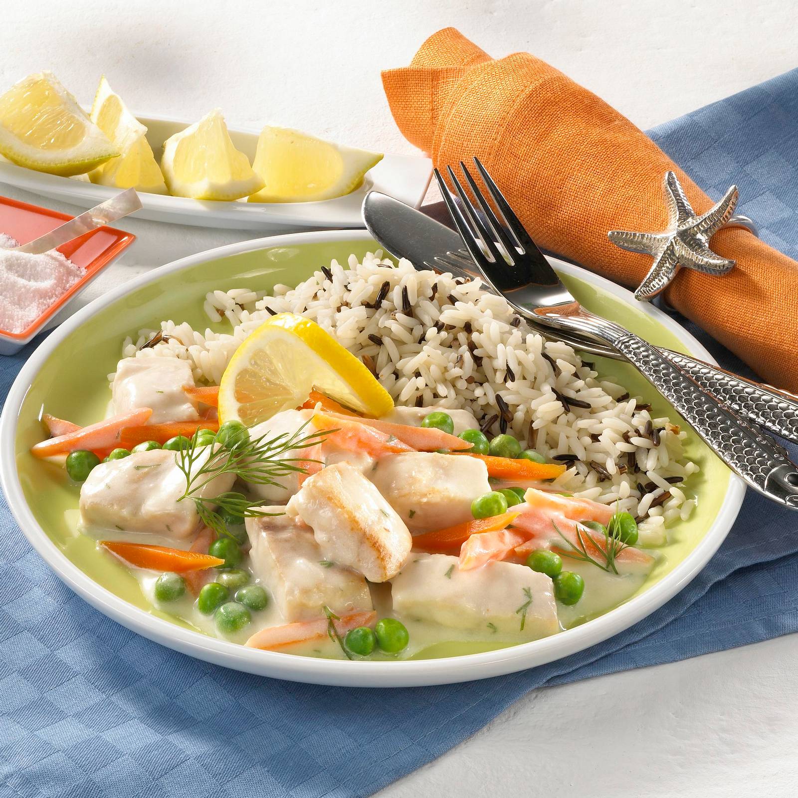 Karotten schälen, in Stifte schneiden und mit den Erbsen in den Einlegeboden des Varoma geben.Fisch trocken tupfen und in ca. 3 cm große Stücke sch ...