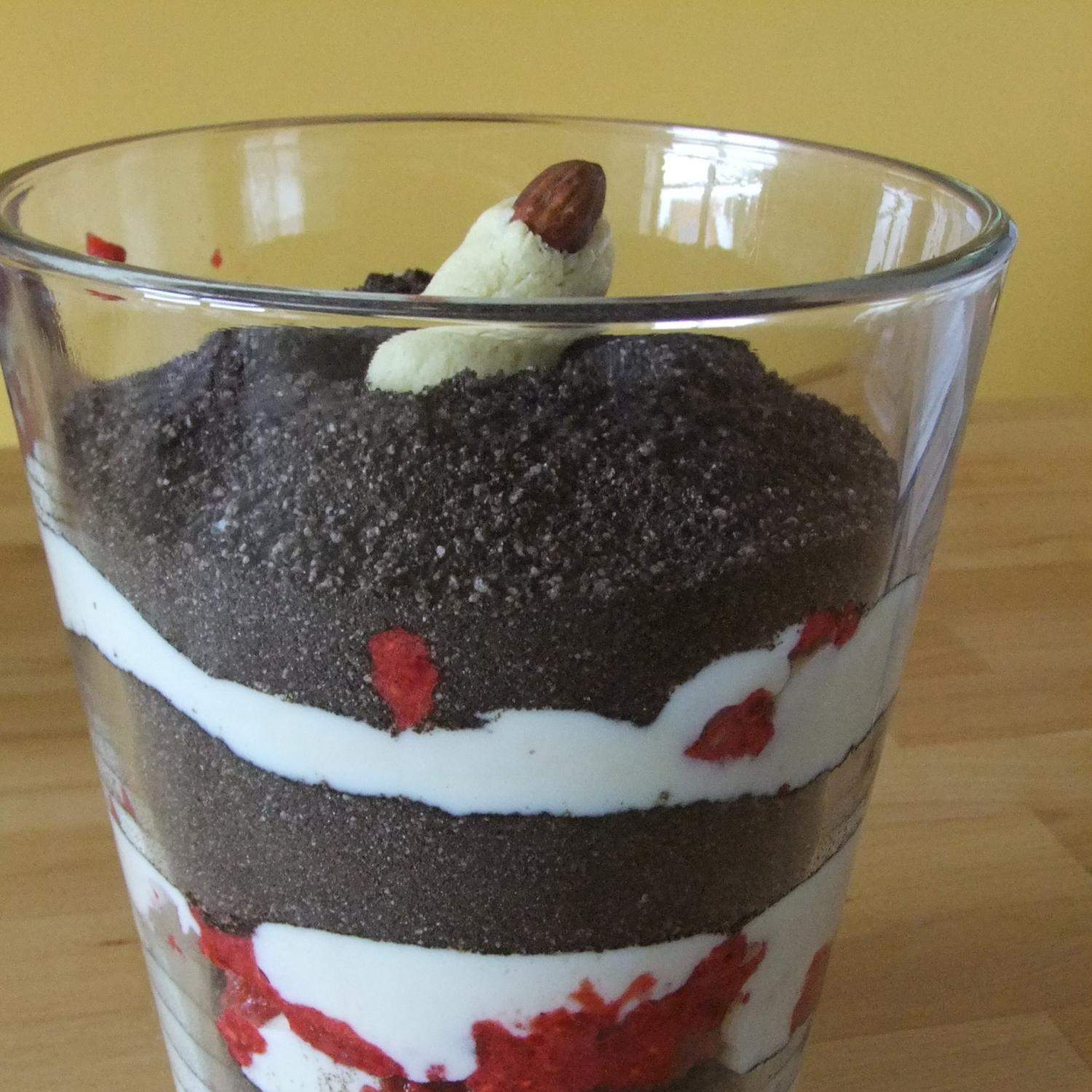 Die Kekse, die mindestens drei Stunden - besser aber über Nacht im Gefrierschrank lagen, 10 sec./[locked]/Stufe 10 schreddern und umfüllen.  Die weiße Schokolade in Stückchen in den Mixtopf geben und 15 sec./[locked]/Stufe 6 hacken. Dann: Schmetterling einsetzen!Eventuell Schokolade vom Rand nach unten schieben und alle übrigen Zutaten einfüllen. 8 Min./[locked]/100°/Stufe ca. 2,5 erhitzen. Umfüllen und etwas Zucker oben drauf streuen, damit sich keine Haut bildet. Den Mixtopf spülen und abtrocknen.  Rote Schicht...